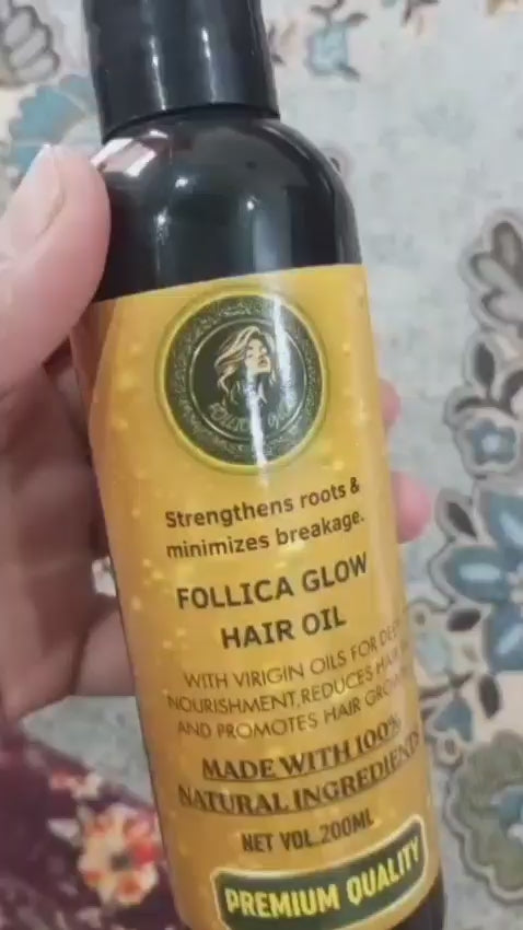 "Follica Glow Hair Oil is your go-to solution for stronger, shinier, and healthier hair. Infused with natural herbs, it nourishes the scalp, promotes hair growth, and reduces breakage — all in one powerful blend."